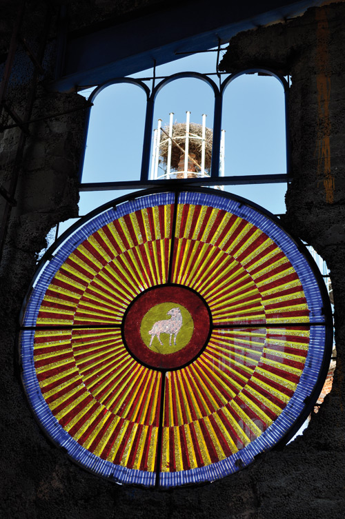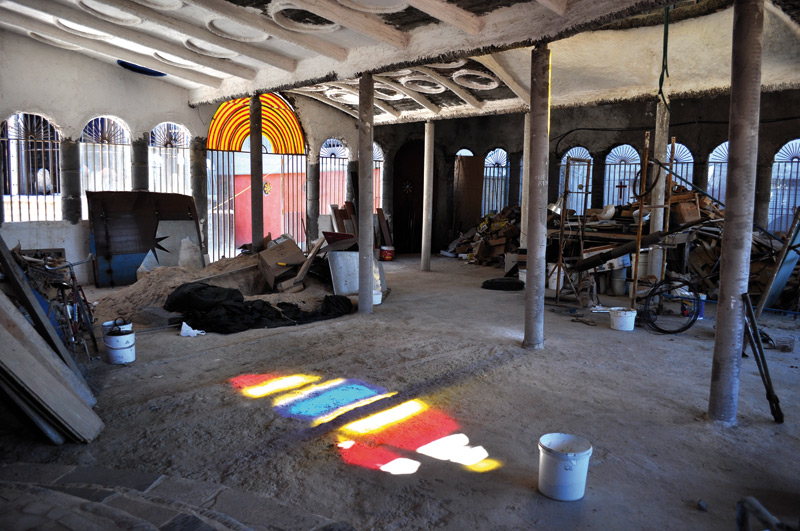 Podríamos decir que la catedral es un ejemplo de reciclaje, la escasez de medios materiales ha hecho aguzar el ingenio para sacar el máximo rendimiento a los pocos recursos disponibles. Esta austeridad imprime un carácter único a cada uno de los elementos del edificio. Todos los materiales han sido donados por empresas de la construcción. Los ladrillos defectuosos desechados por la fábrica son la materia prima que da forma a los muros, los restos de cristales son la base para las luminosas vidrieras, una rueda de bicicleta cumple a la perfección la función de una polea. En la catedral de Justo no hay nada superfluo, todo es útil. Los objetos de uso cotidiano cobran aquí una nueva dimensión: los bidones vacíos de gasolina sirven de molde para las altísimas columnas, para hacer las barandillas usa botes de Cola Cao rellenos de hormigón. Un elemento fundamental son los muelles, de diferente longitud y diámetro. Justo los usa para casi todo: como estructura para todo tipo de arcos, para hacer el perímetro de los escalones, como base de los capiteles y las columnas… La polivalencia de este elemento ha aportado soluciones novedosas a numerosos problemas técnicos.