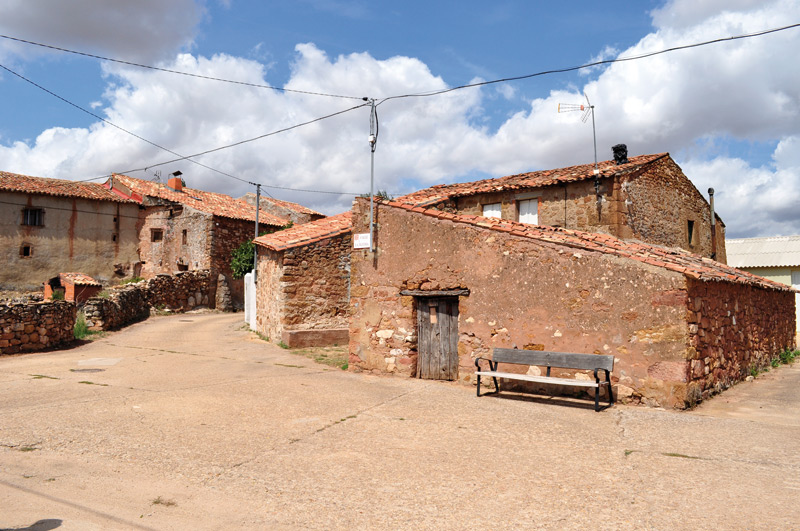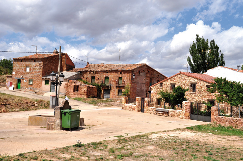 La plaza es un amplio espacio vacío en cuyo centro una fuente, construida en 1933, y una solitaria farola se hacen compañía en los largos días de verano y en los fríos de invierno. El caserío tiene las características típicas de la zona: robustas y sobrias casas de piedra arenisca roja. Si bien las construcciones no guardan la armonía de casillas, el pueblo vecino, son pocas las casas de moderna factura.