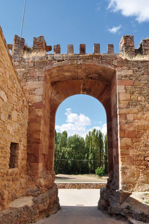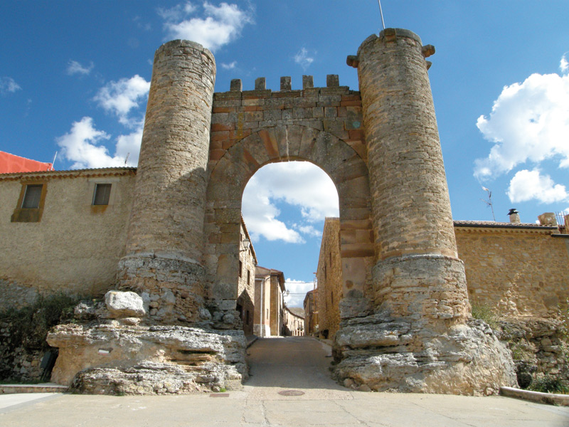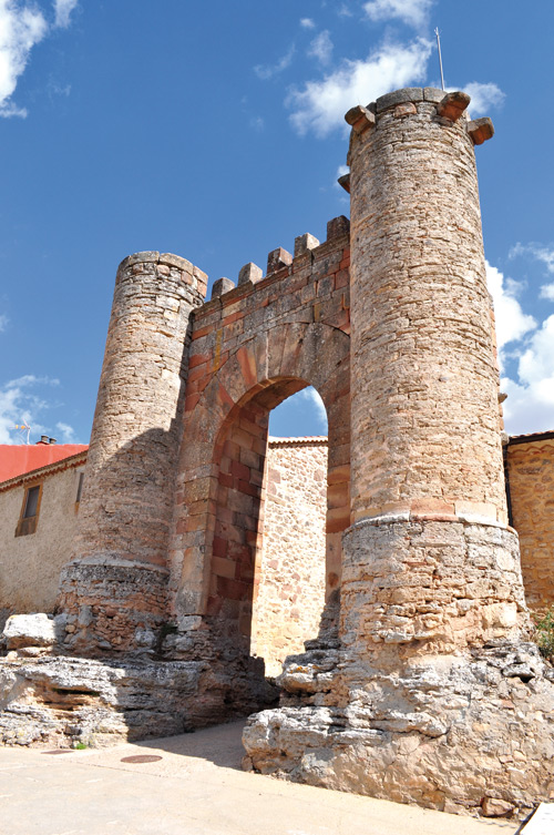 arco de medio punto almenado y flanqueado por torres cilíndricas.